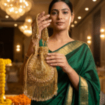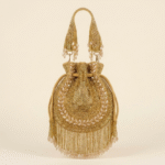 The lower half of the bag features a dense, high-shine Cutdana fringe finished with teardrop crystal tips, creating a captivating sense of movement and “swing.” As a full-size potli, it is specifically designed to be as practical as it is beautiful, comfortably housing all your essentials for long events. Finished with a heavily worked top handle and ornate tassels, it is a true testament to timeless craftsmanship.