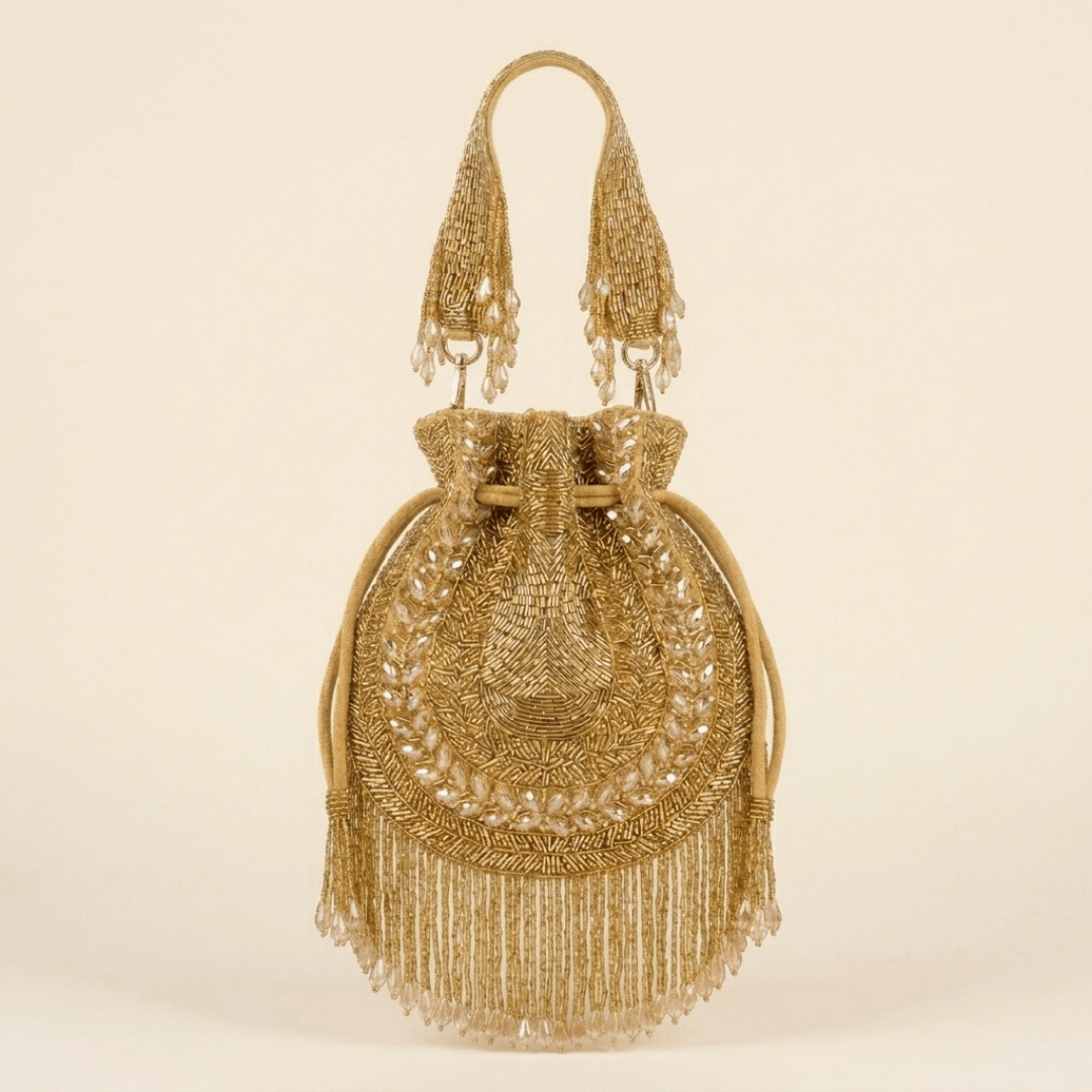 Embroidery Technique: Intricate Cutdana work (glass tubes) applied in a multi-directional geometric pattern. Crystal Detailing: Premium glass crystals hand-set in a halo formation to enhance the central motif. The Fringe: Luxurious, long-drop Cutdana fringe with crystal droplet endings for a fluid, shimmering aesthetic. Tassels: Oversized, artisanal latkans featuring coordinated bead and crystal work. Closure: Smooth-gliding drawstring closure with reinforced eyelets. Interior: Fully lined with premium, snag-resistant suade. |