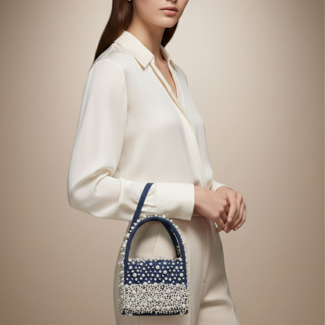 The Azure Mini Denim Bag by Tweak with Aaru is an elegant handcrafted bag features intricate pearl or crystal beadwork meticulously set on a rich denim base, creating a striking contrast of texture and shine. The lower half is densely embellished with layered pearls and crystals for a luxurious, couture finish, while the upper section is adorned with delicately spaced bead detailing for refined balance. A beautifully hand-embellished handle, highlighted with pearls and crystals, adds structure and statement appeal—making this bag a perfect blend of modern denim charm and timeless festive elegance.