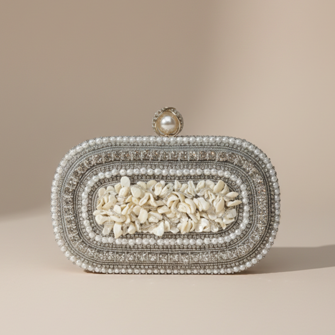 Intricately embellished with pearls, stones, and fine beadwork ,Elegant structured hard body for durability and shape ,Statement pearl clasp closure ,One side work ,1 main compartment with secure button closure ,Detachable golden chain strap for versatile styling (clutch/sling) |