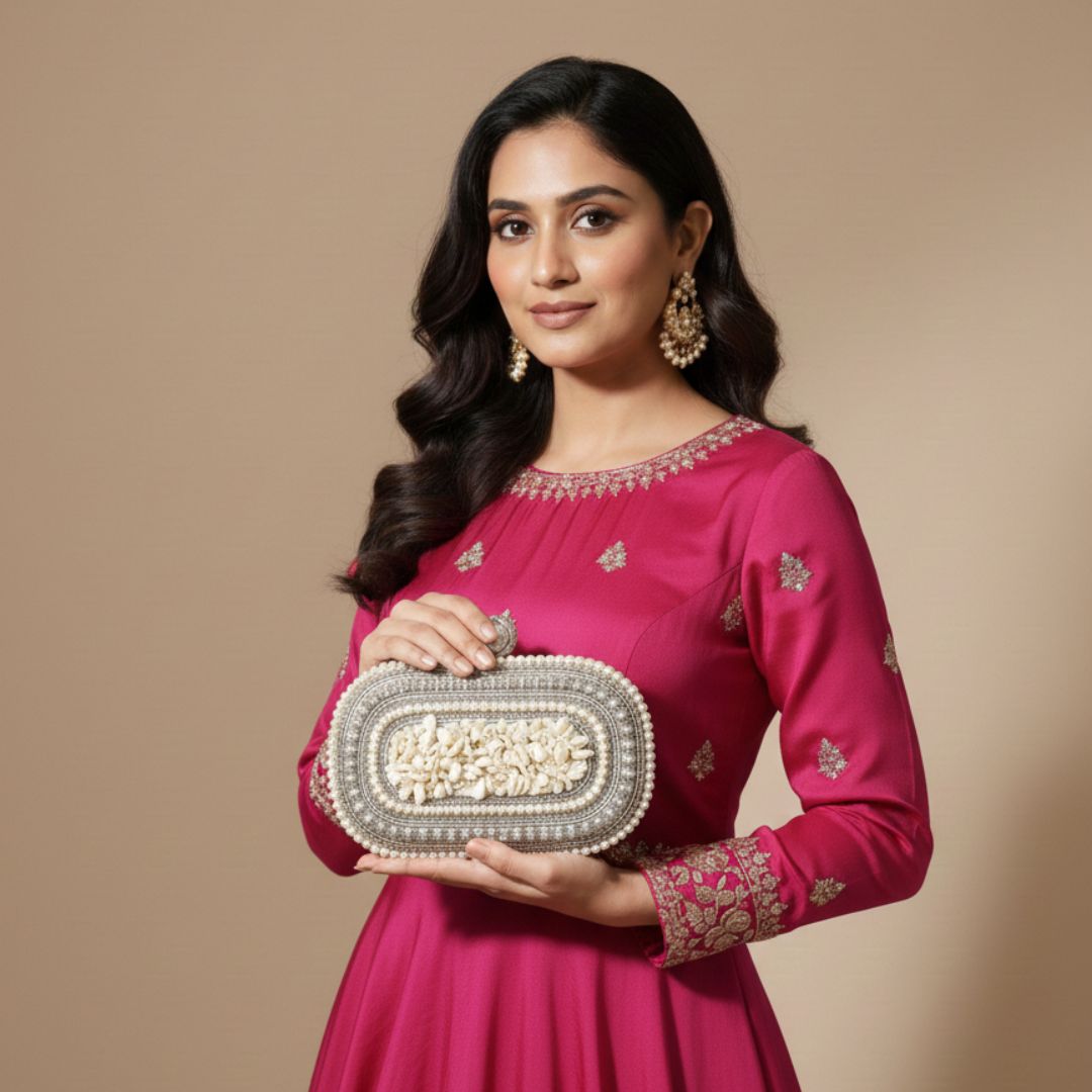 A perfect companion for weddings, festive celebrations, and cocktail evenings, this clutch adds a touch of shimmer and sophistication to sarees, lehengas, gowns, and chic western outfits alike.