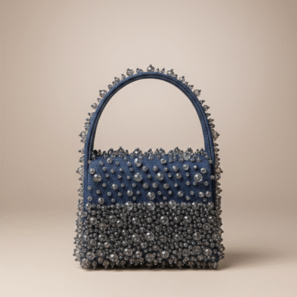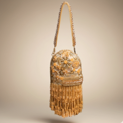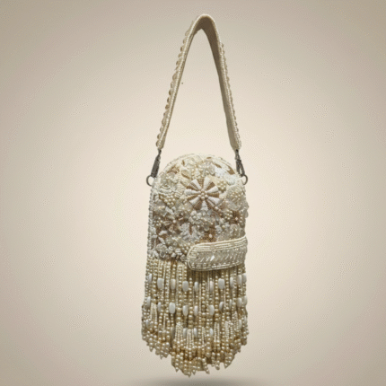 Graceful and timeless, the Dhara Pearl Potli is a statement of elegance and intricate craftsmanship. Beautifully handcrafted with layers of delicate pearl detailing, this potli features a soft gathered silhouette adorned with fine beadwork and tassel accents. The pearl handle adds a regal charm while making it easy to carry for special occasions. Perfect for weddings, festive celebrations, and evening events, this piece effortlessly complements both traditional attire and modern fusion looks.