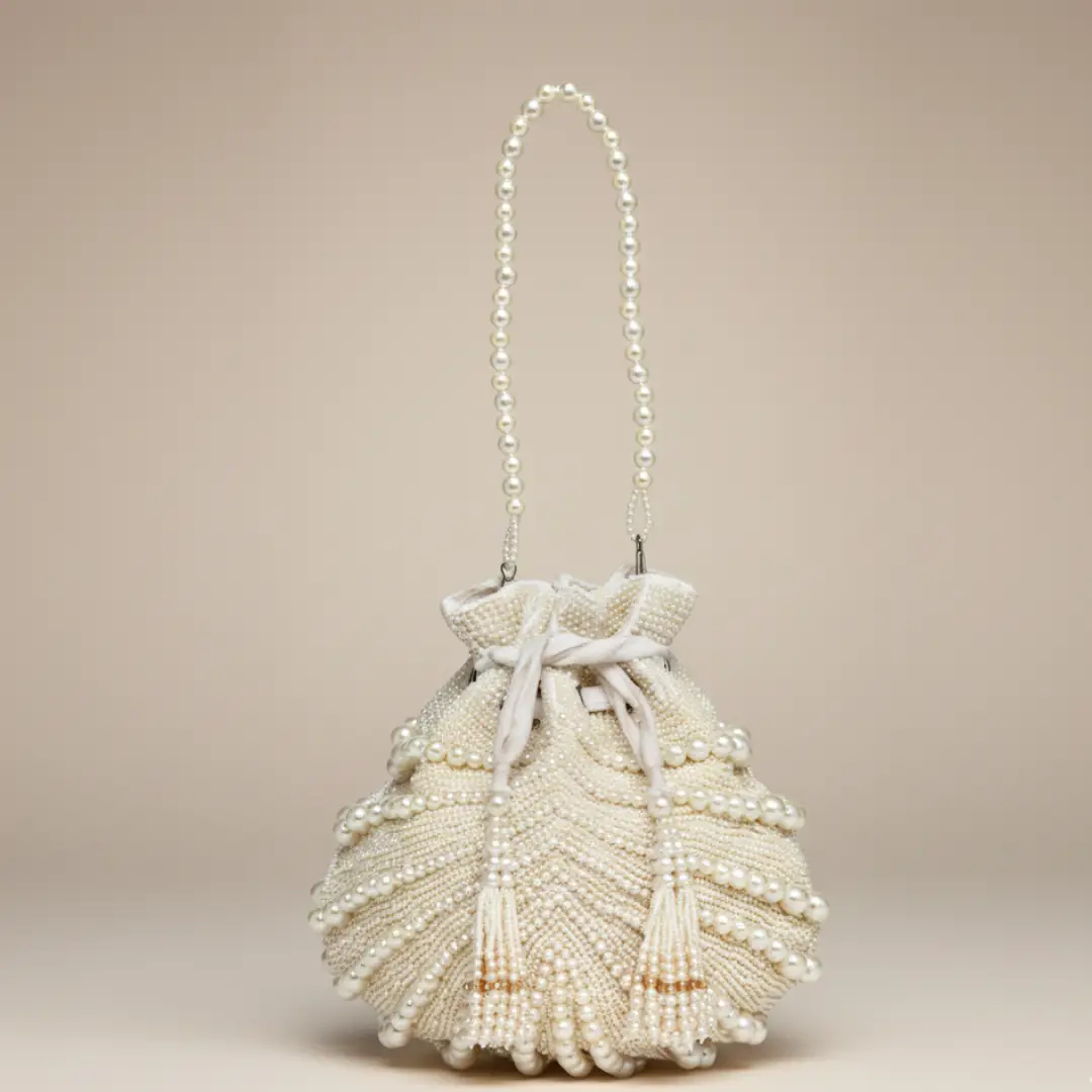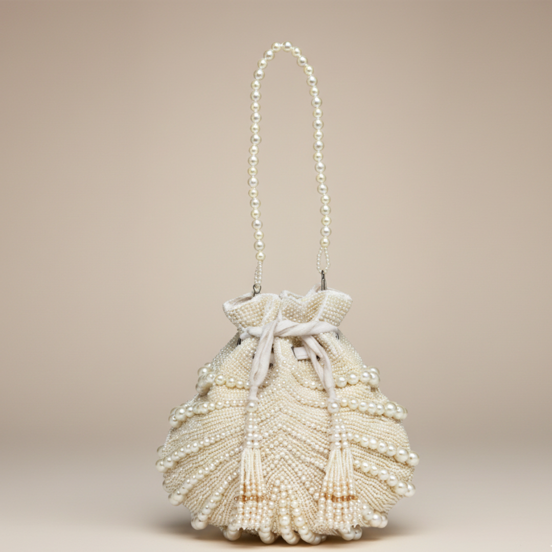 A perfect pick for weddings, festive gatherings, and special occasions, this pearl potli pairs beautifully with lehengas, sarees, and suits, while also adding a soft, elegant touch to contemporary western outfits.