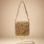 Graceful and festive bag is a stunning blend of traditional charm and modern elegance. Beautifully handcrafted with intricate beadwork and embellishments, this bag features a scalloped flap design adorned with soft cascading fringes that add movement and richness. The detailed shoulder strap with tassel accents enhances its artisanal appeal, making it a perfect pick for weddings, festive occasions, and celebratory evenings. It pairs effortlessly with ethnic wear and adds a statement touch to contemporary western looks as well.
