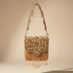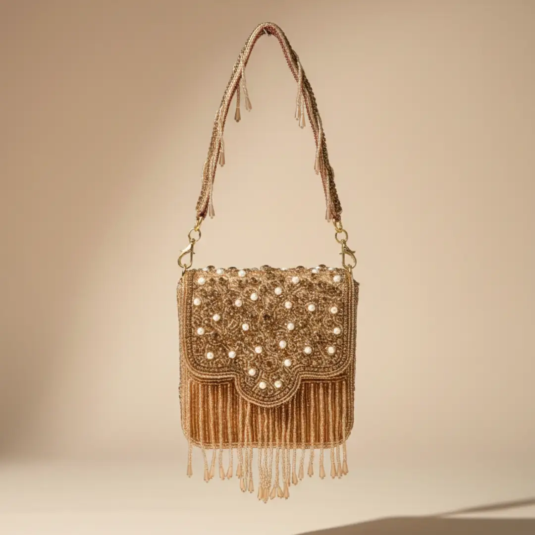 Graceful and festive bag is a stunning blend of traditional charm and modern elegance. Beautifully handcrafted with intricate beadwork and embellishments, this bag features a scalloped flap design adorned with soft cascading fringes that add movement and richness. The detailed shoulder strap with tassel accents enhances its artisanal appeal, making it a perfect pick for weddings, festive occasions, and celebratory evenings. It pairs effortlessly with ethnic wear and adds a statement touch to contemporary western looks as well.