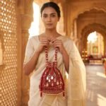 The bag’s exterior is adorned with a precise diamond-patterned bead lattice, interspersed with teardrop-shaped mirrors that provide a “shattered glass” sparkle. The bottom fringe detailing is composed of delicate seed beads and pearls, creating a graceful rhythmic motion as you walk. With its ornate beaded handle and plush drawstring tassels, this bag is a functional work of art. Whether paired with a contemporary gown or traditional ethnic attire, this statement bucket bag serves as the crown jewel of your ensemble.