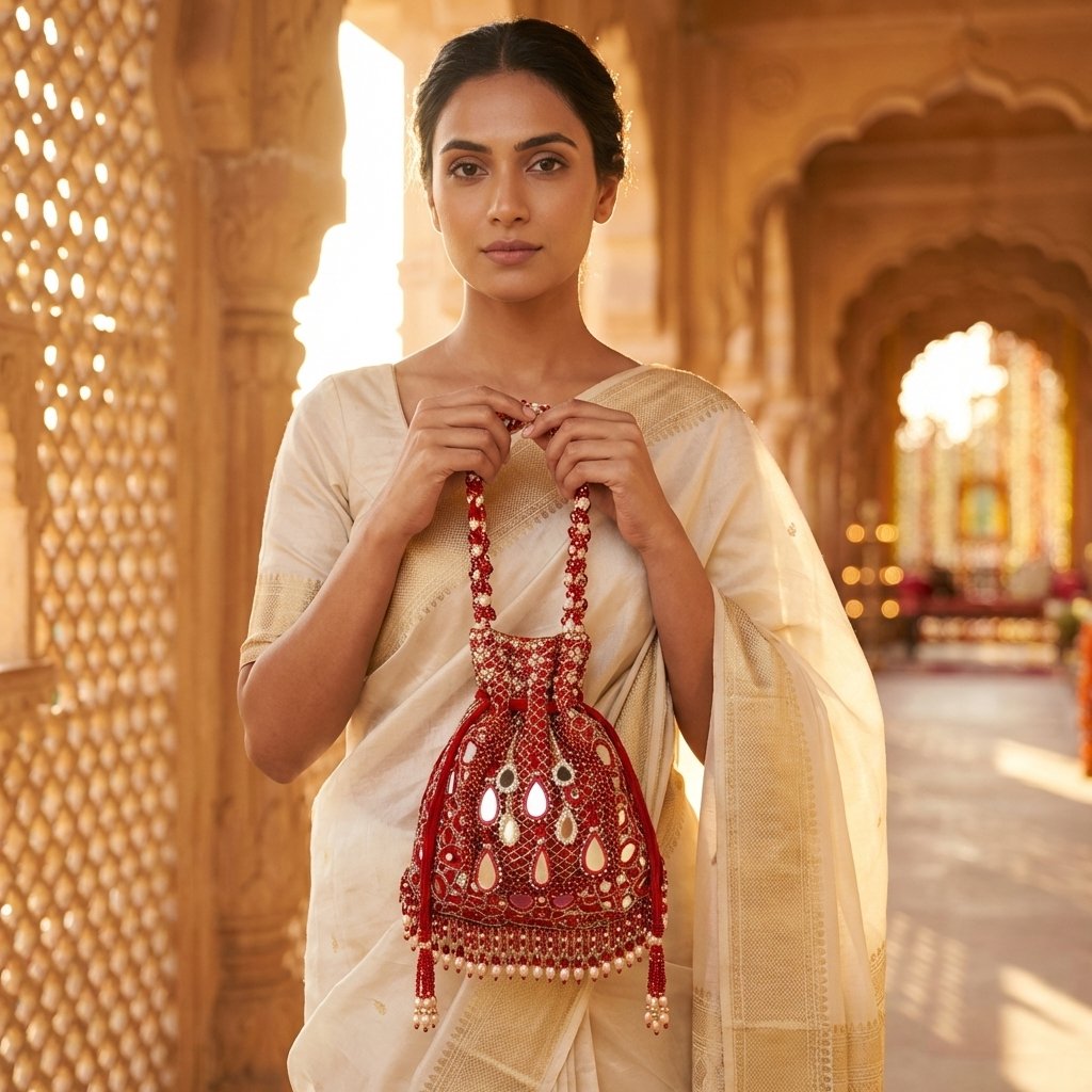Premium Heavy-Weight Suade for a rich, Real Reflective Glass Mirrors, metallic zardosi-style threads, and high-luster seed pearls.Fully Hand-Wrapped Beaded Strap for maximum durability and comfort.Double-pull Suade Drawstrings finished with oversized beaded tassels.Lined with smooth tonal high quality fabric to keep your valuables scratch-free. |