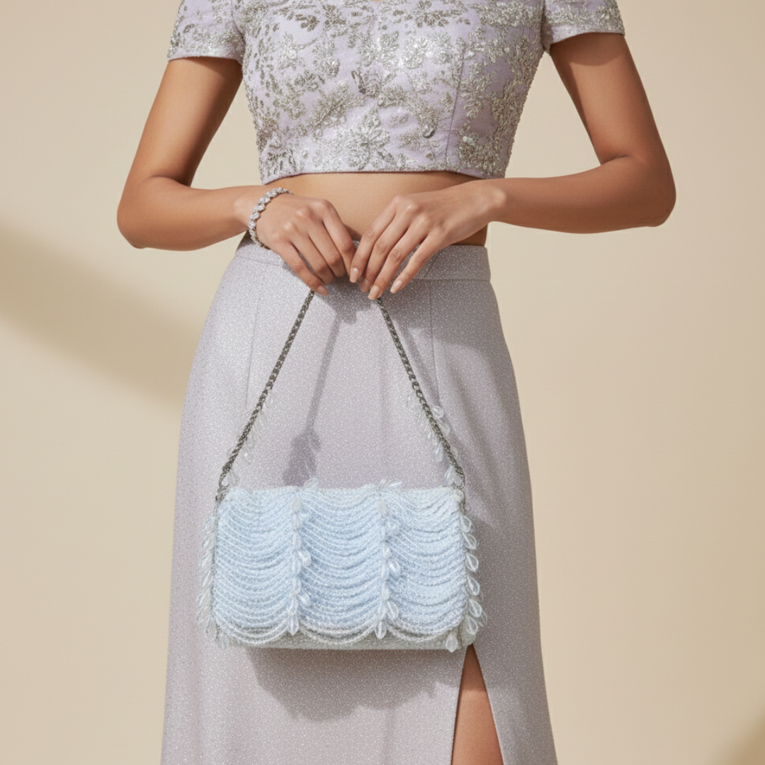 The Jazine Flap Bag by Tweak with Aaru is an exquisitely crafted statement accessory designed to turn heads. Showcasing intricate hand-embellished crystal work in cascading patterns, this flap-style bag exudes luxury from every angle. Its structured silhouette offers ample room for essentials, secured by a well-designed flap closure that blends elegance with everyday practicality.