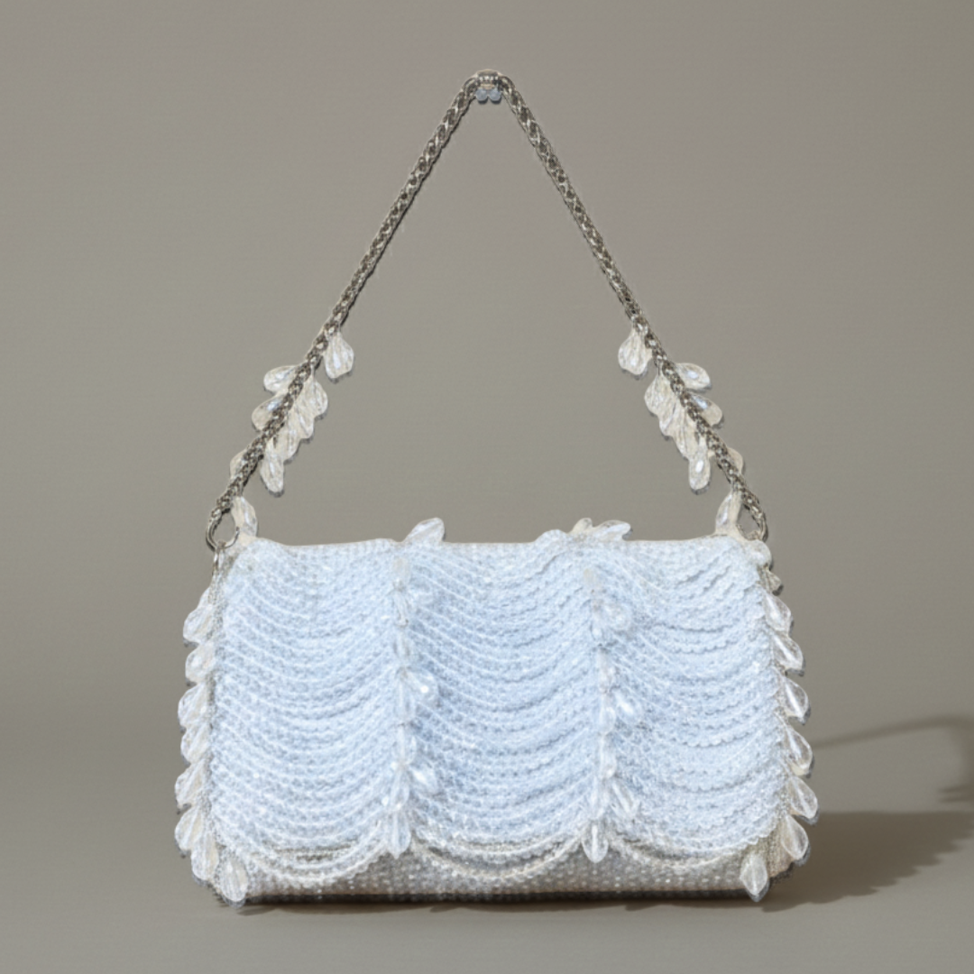 A chic embellished flap bag featuring intricate crystal work and a beautifully detailed handle. Elegant, versatile, and ideal for both day and evening wear.