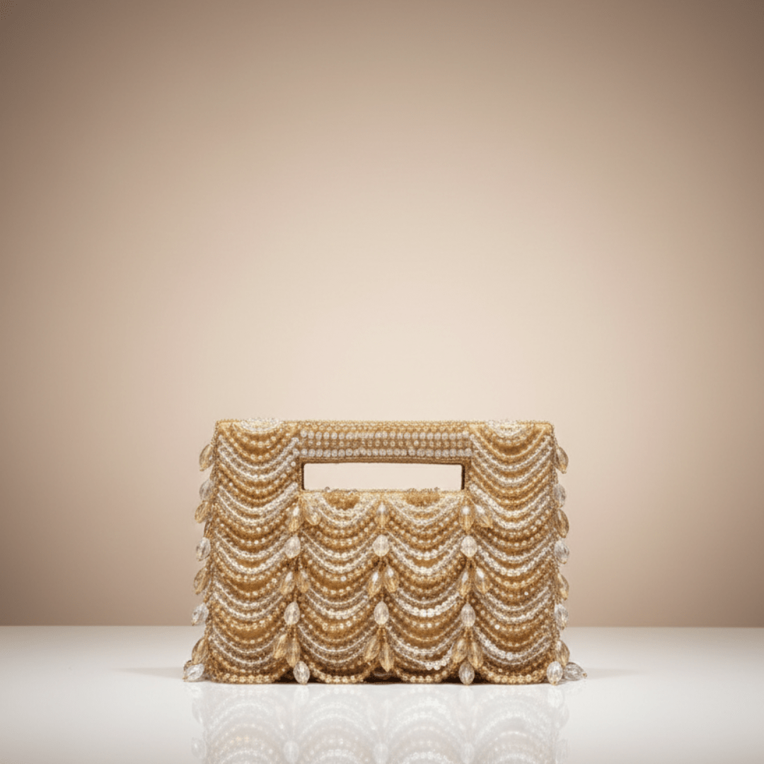 Make an unforgettable entrance with a clutch that defines artisanal luxury. Meticulously handcrafted by skilled artisans, this bag features layers of premium beads arranged in a rhythmic, wave-like pattern. The cascading “drip” effect of the beads adds a three-dimensional depth that catches the light from every angle.
