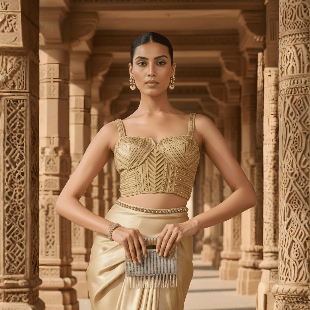 The structured rectangular frame is complemented by a modern cutout handle, offering a seamless and chic way to carry your essentials. Beyond its stunning exterior, the interior is lined with soft fabric to ensure your phone, cards, and lipstick are kept safe and scratch-free. Whether paired with a contemporary gown or traditional festive attire, this beaded handbag is the ultimate finishing touch for the discerning fashionista.