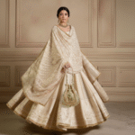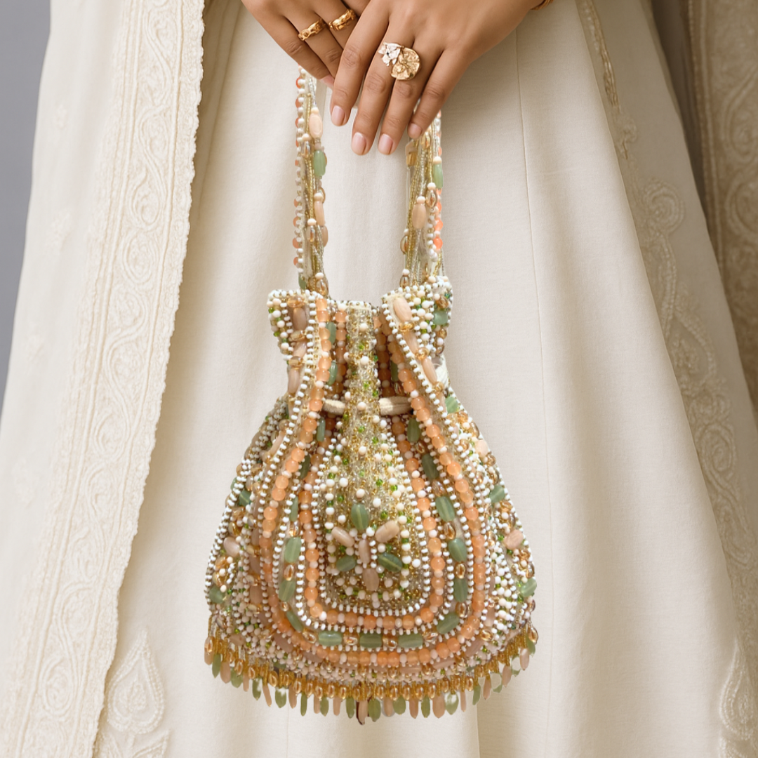 Handcrafted with stones, kundan red & green beads, tassels, and a beaded handle, this suede potli blends elegance with durability. Spacious enough for your essentials, it’s the perfect festive statement piece.