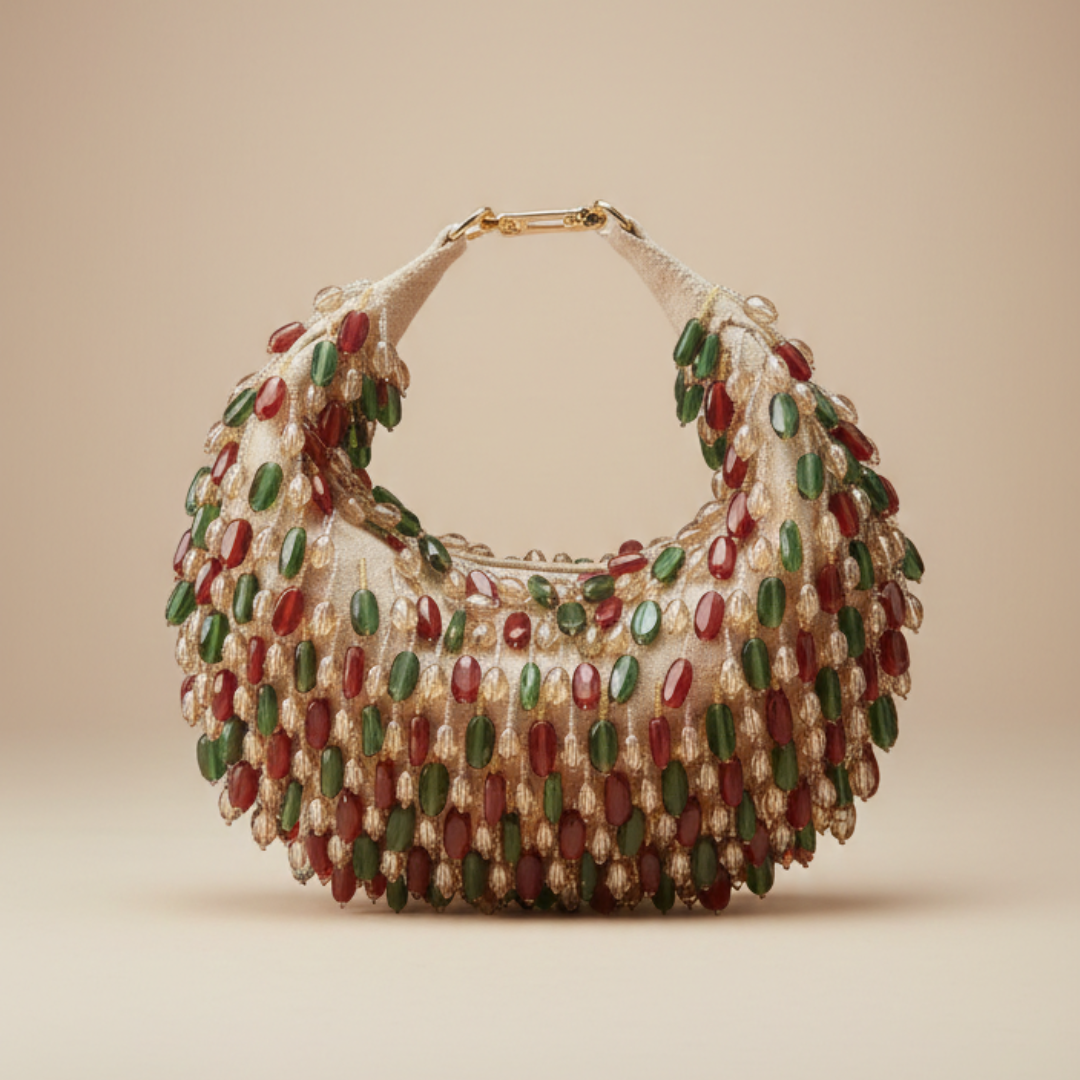 A chic embellished hobo with crystal detailing, zip closure, three external pockets, and a detachable sling strap. Stylish, versatile, and perfect for both day and evening looks.