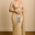 Handcrafted with intricate cutdana, radiant stones, fine zari, lustrous beads, and delicate handmade tassels for timeless elegance. |