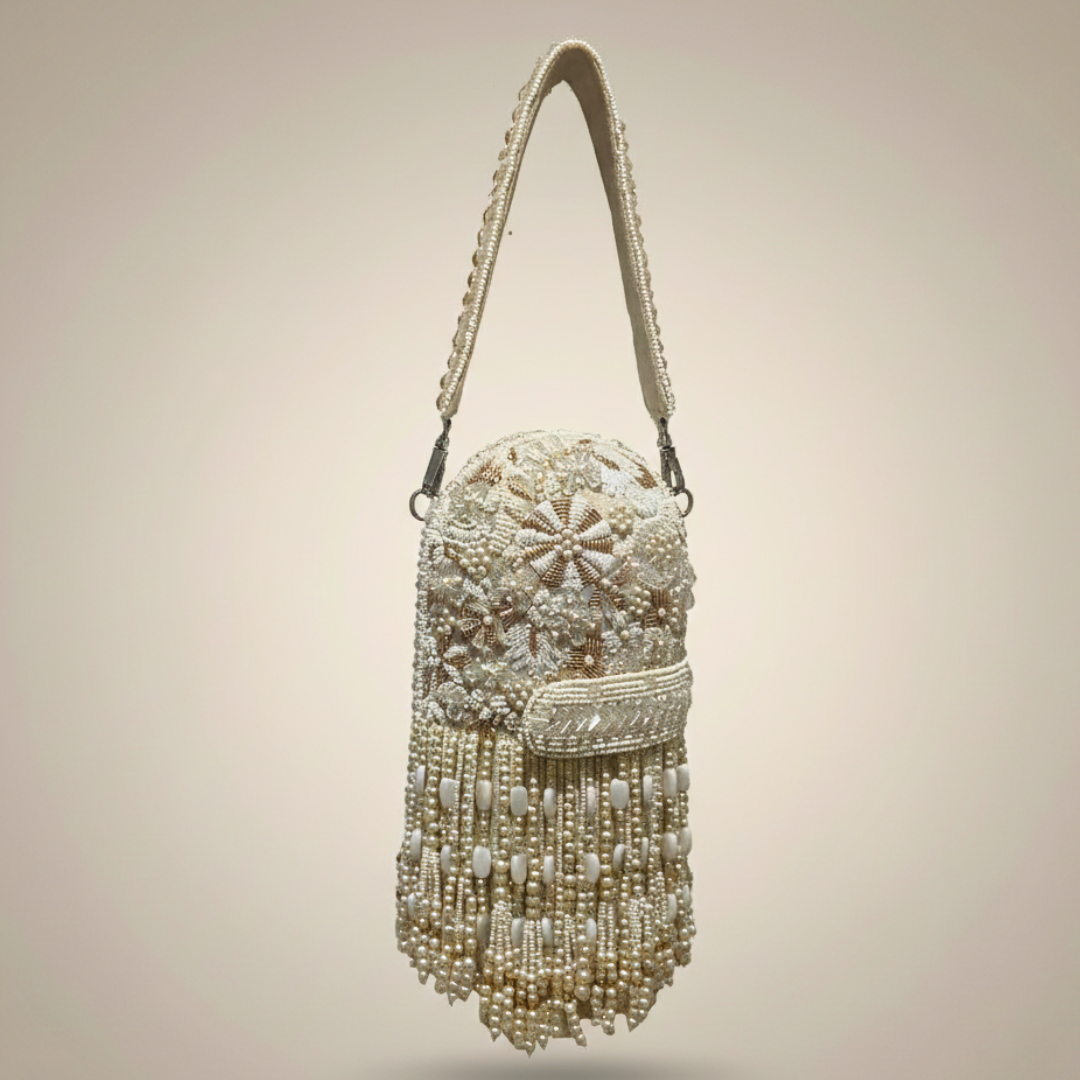 Tara Capsule Clutch Bag is a handcrafted masterpiece that blends timeless glamour with modern elegance. Adorned with radiant stones, cutdana, zari, and beads, this designer clutch features delicate handmade tassels, a beaded handle, and a luxurious suede finish inside and out. With its signature capsule silhouette, it’s spacious enough to hold your essentials while adding a touch of quiet opulence to every outfit.