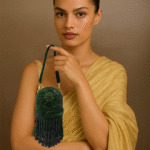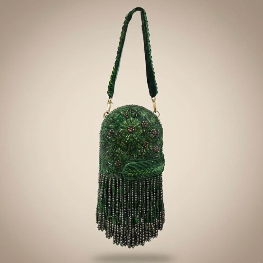 Tara Capsule Clutch Bag is a handcrafted masterpiece that blends timeless glamour with modern elegance. Adorned with radiant stones, cutdana, zari, and beads, this designer clutch features delicate handmade tassels, a beaded handle, and a luxurious suede finish inside and out. With its signature capsule silhouette, it’s spacious enough to hold your essentials while adding a touch of quiet opulence to every outfit.